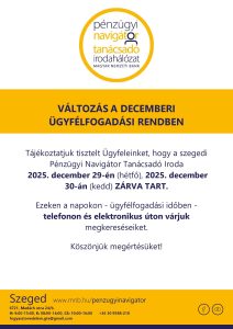 Szeged PNTI – nyitva tartás és ügyfélfogadás módosulás 2025.12.29. – személyes ügyfélfogadás szünetel Calendar Hozzáadás a naptárhoz Add hozzá a Timely Calendar-hoz! Add a Google-hez! Add az Outlook-hoz! Add hozzá egy Apple naptárhoz! Add hozzá egy másik naptárhoz! Export to XML Mikor: 2025-12-29 @ 09:00 – 15:00 2025-12-29T09:00:00+01:00 2025-12-29T15:00:00+01:00 Hol: Szeged PNTI Szeged Madách u. 24/b.