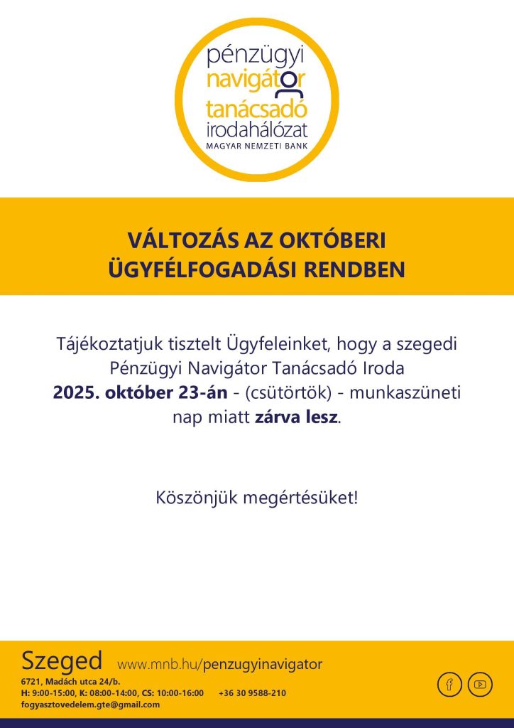Szeged PNTI – személyes ügyfélfogadás és nyitva tartás 2025.10. hó Közzétette 2025-10-01 szerző admin